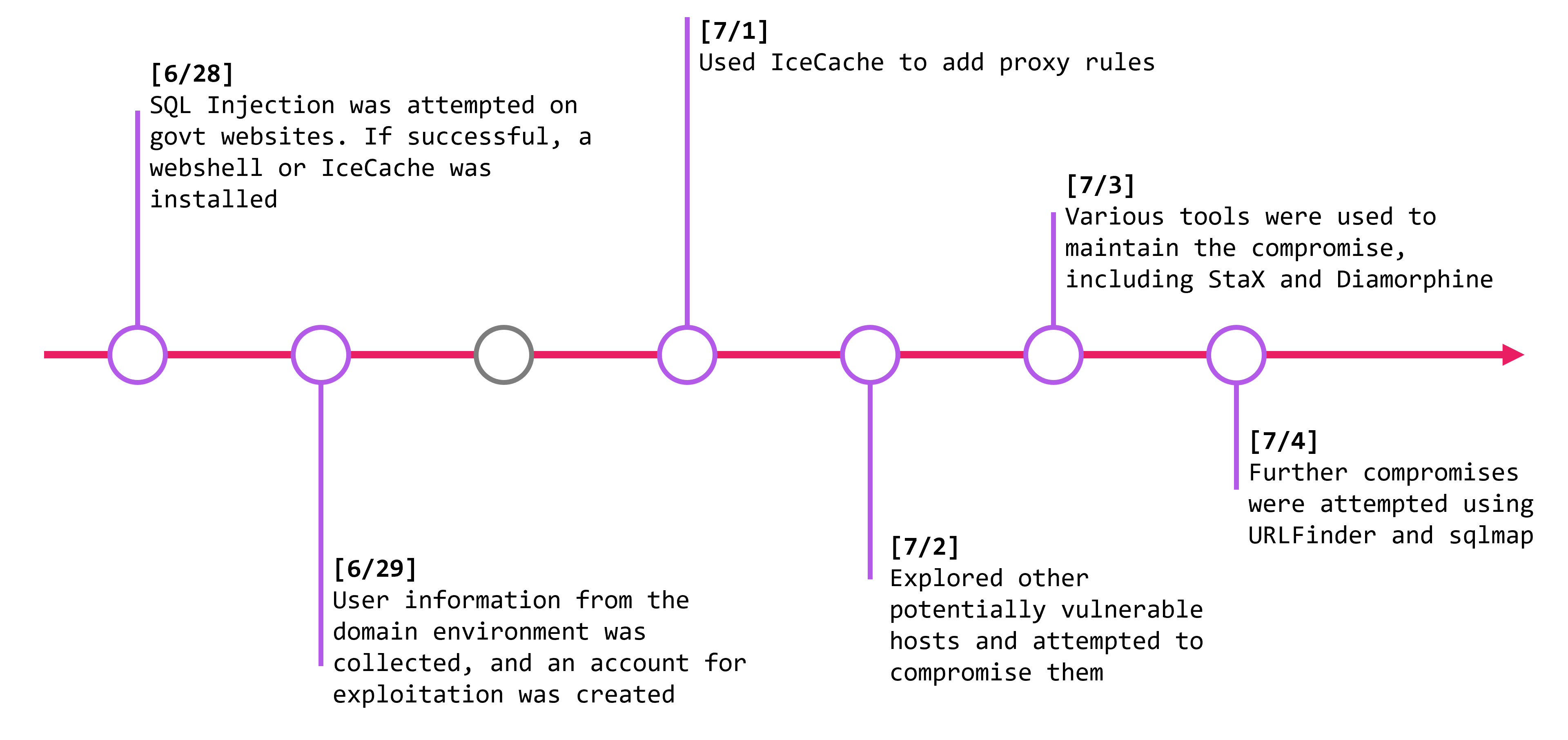 Over the course of two weeks, the attacker utilized a variety of tools and commands to compromise government websites and exfiltrate information.