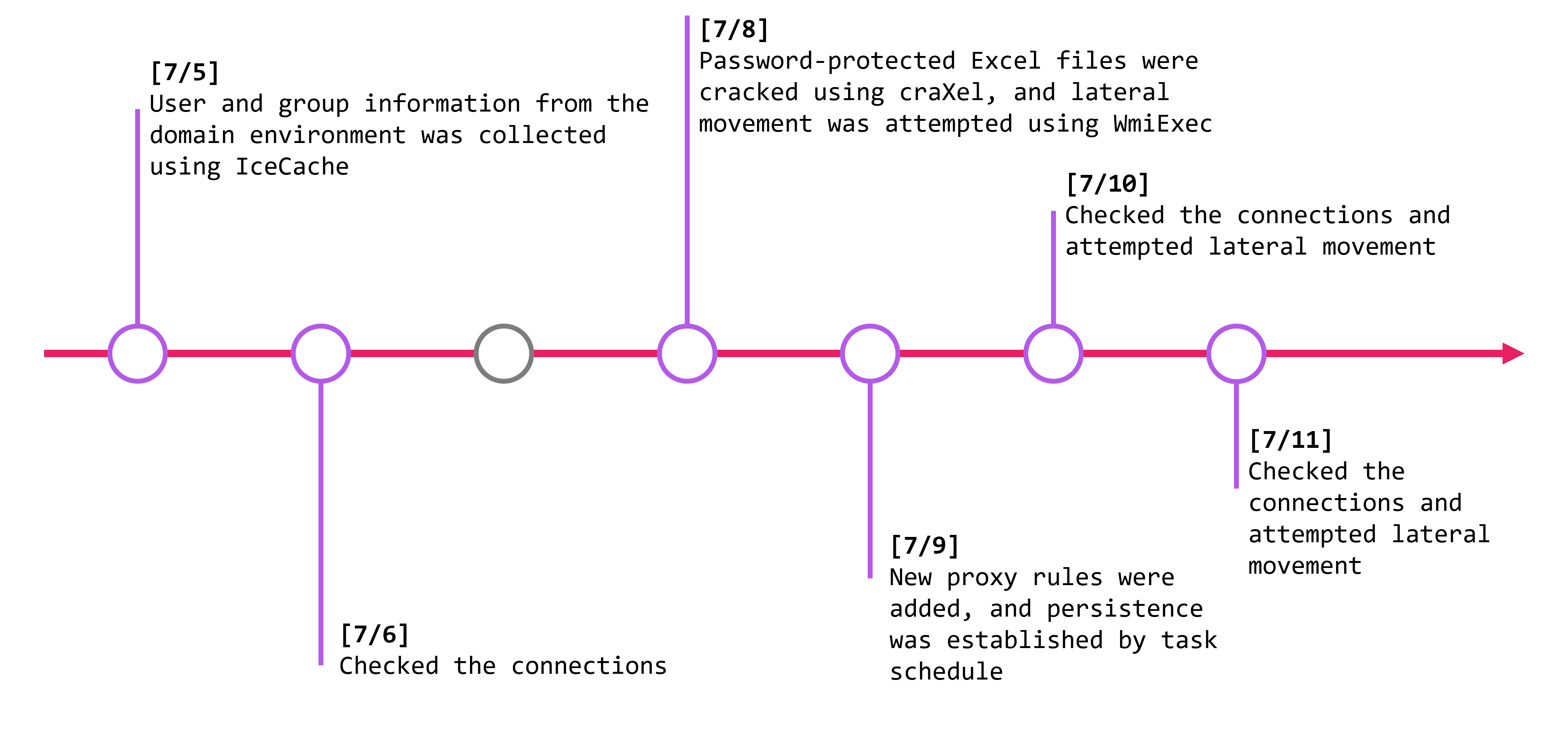 Unlike a typical timeline created by an IR or SOC analyst, this one offers insight from the attacker’s perspective. We could observe their trial-and-error process and how they executed the intrusion.