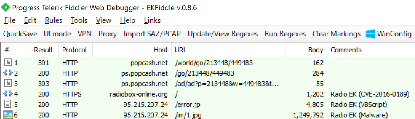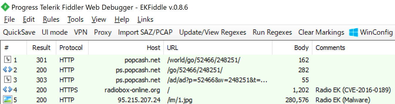 When redirected from the ad-network to https [:] // radiobox-online.org, code that exploits CVE-2016-0189 will be executed. This is not obfuscated and is the same as PoC. The important code is this.