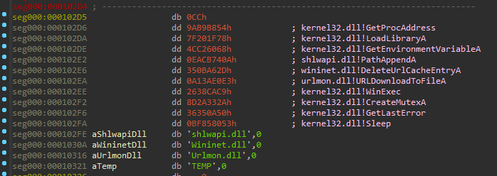 The decoded shellcode is a simple code that downloads and executes a malwre. The list of APIs to use is as follows: