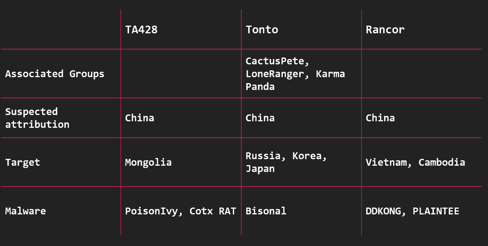 Group-A is targeting Southeast Asia. Periscope and Conimes ware active at the same time and share the same techniques. Conimes and Rancor ware also active at the same time and share some techniques. We believe these groups are close and may share tools and insights.
