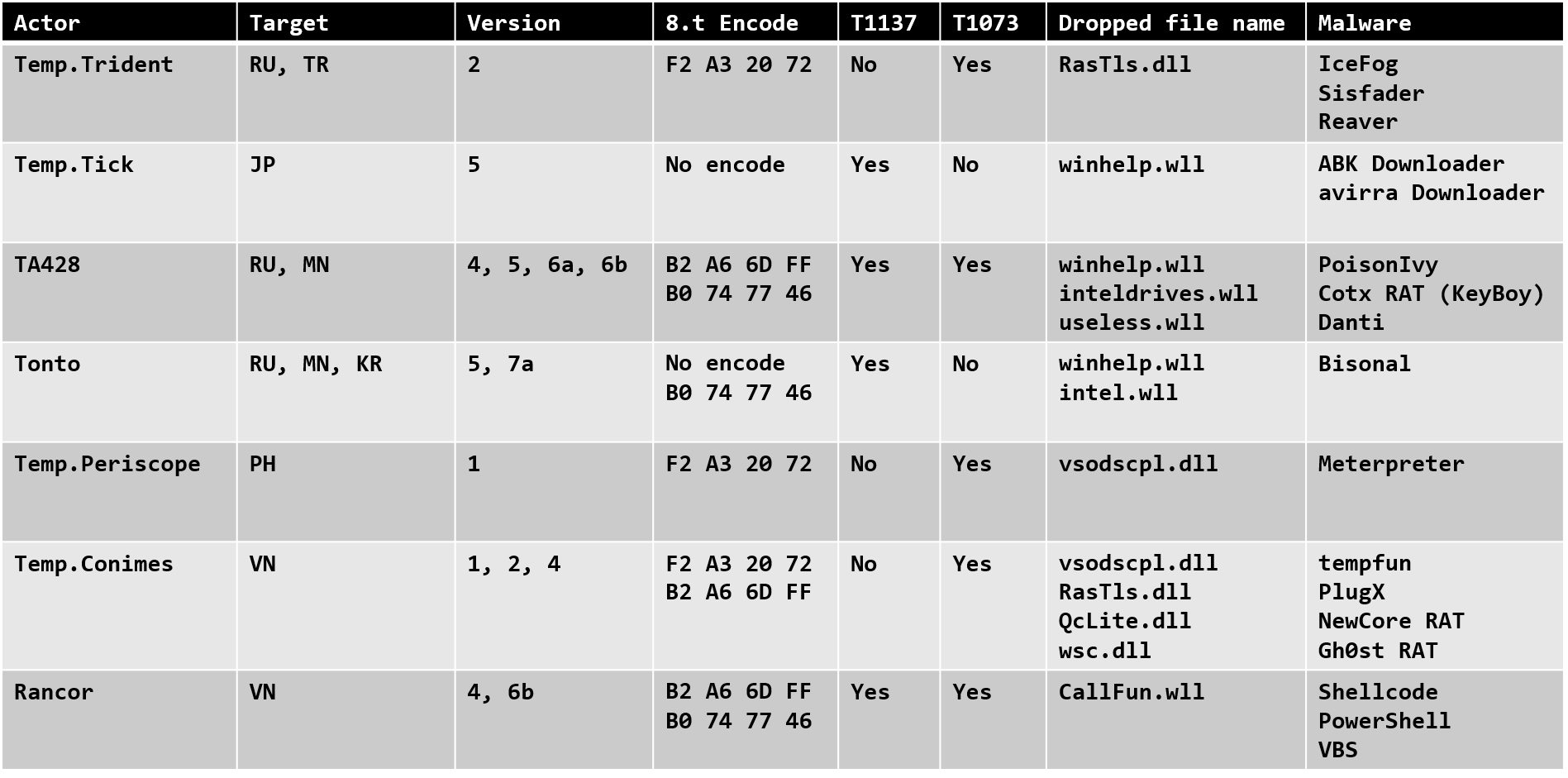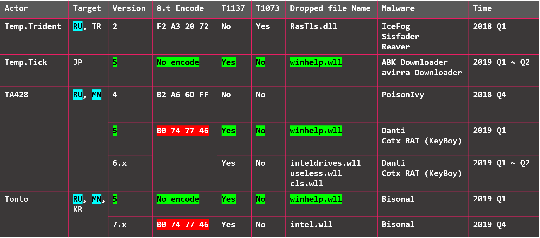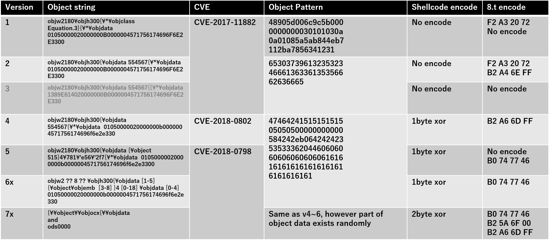 Classification v1-v5 defined by Proofpoint and Anomali published at VB2019. We are doing more research about RTF Object. RTF analysis showed that there was a special byte sequence immediately before the shellcode. We called that an object pattern. 8.t encoding is not distinguished by version. It’s considered an actor distinction rather than a tool distinction.