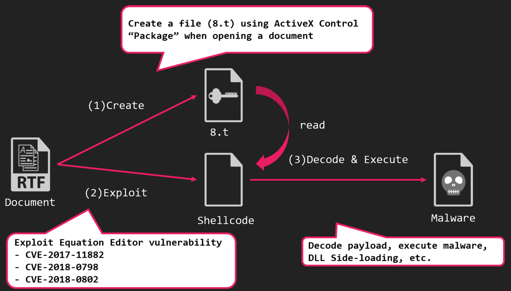 The RTF file created using the Royal Road exploits a vulnerability in the equation editor. The RTF file has a various of characteristics that help with attribution. There are many actors who use Royal Road. We can divide them into three groups and suppose connections between actors.