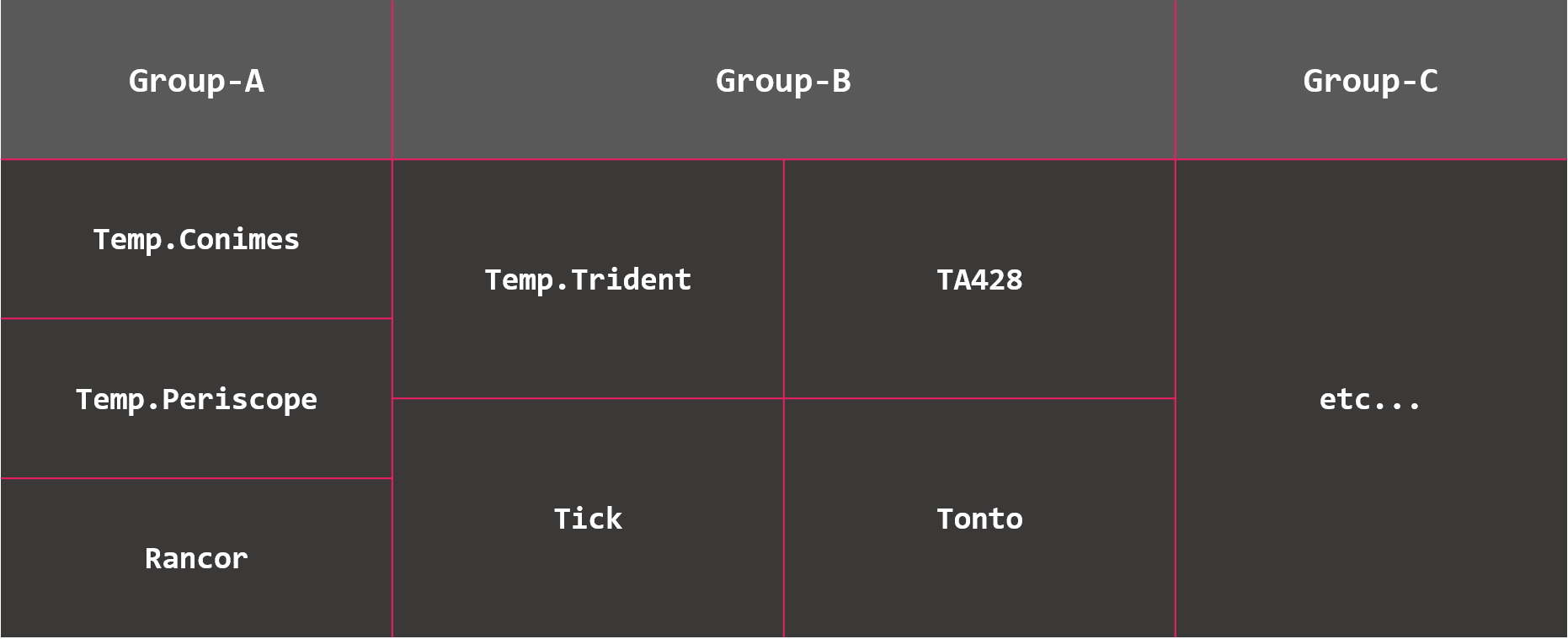 Group-B is including Trident, Tick, TA428 and Tonto. These are actors targeting East Asia, especially Russia, Korea and Japan. Tick, TA428 and Tonto may use the same technique. Especially Tick and Tonto are very similar. We believe that Group-B actors are very close and share techniques and insights.